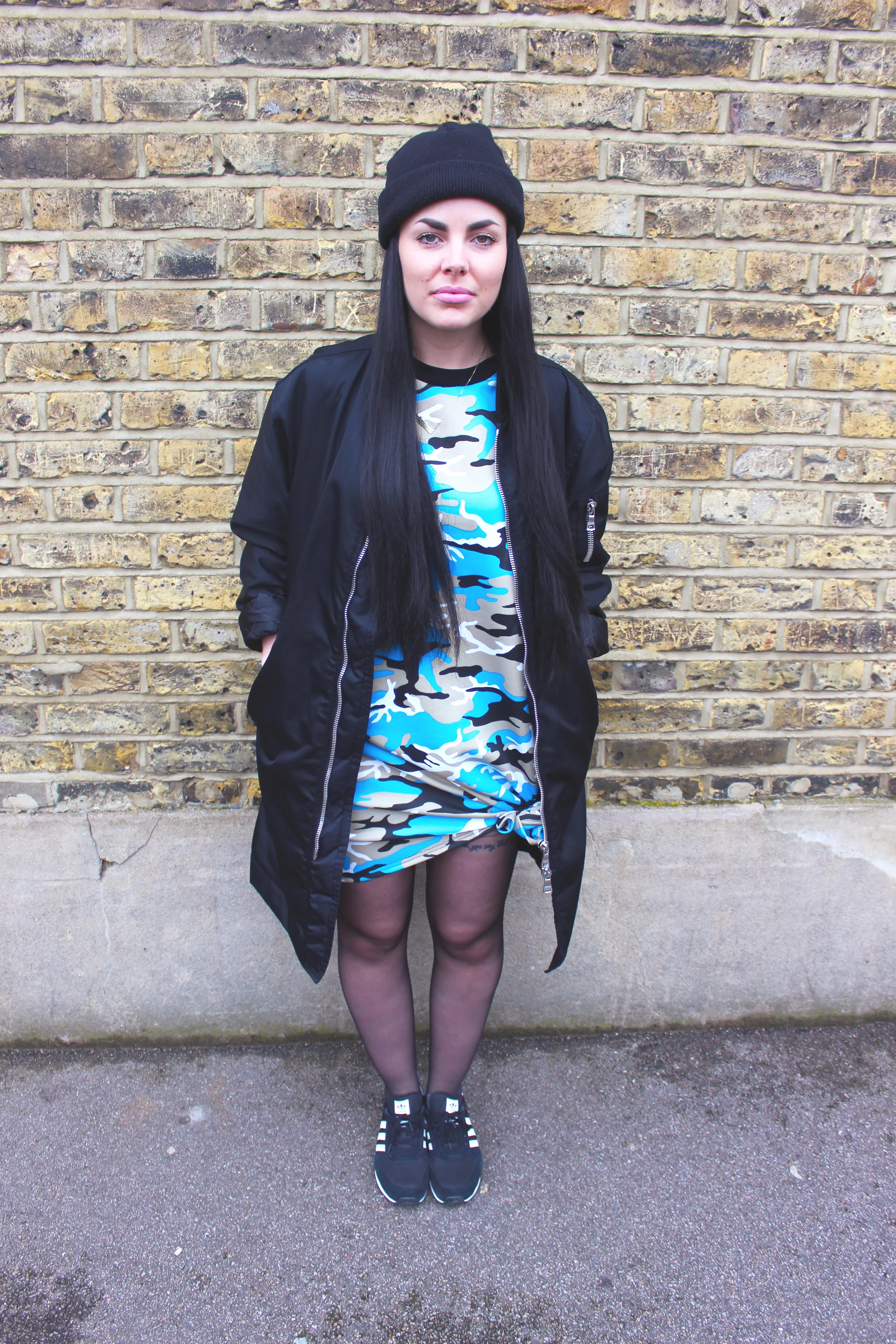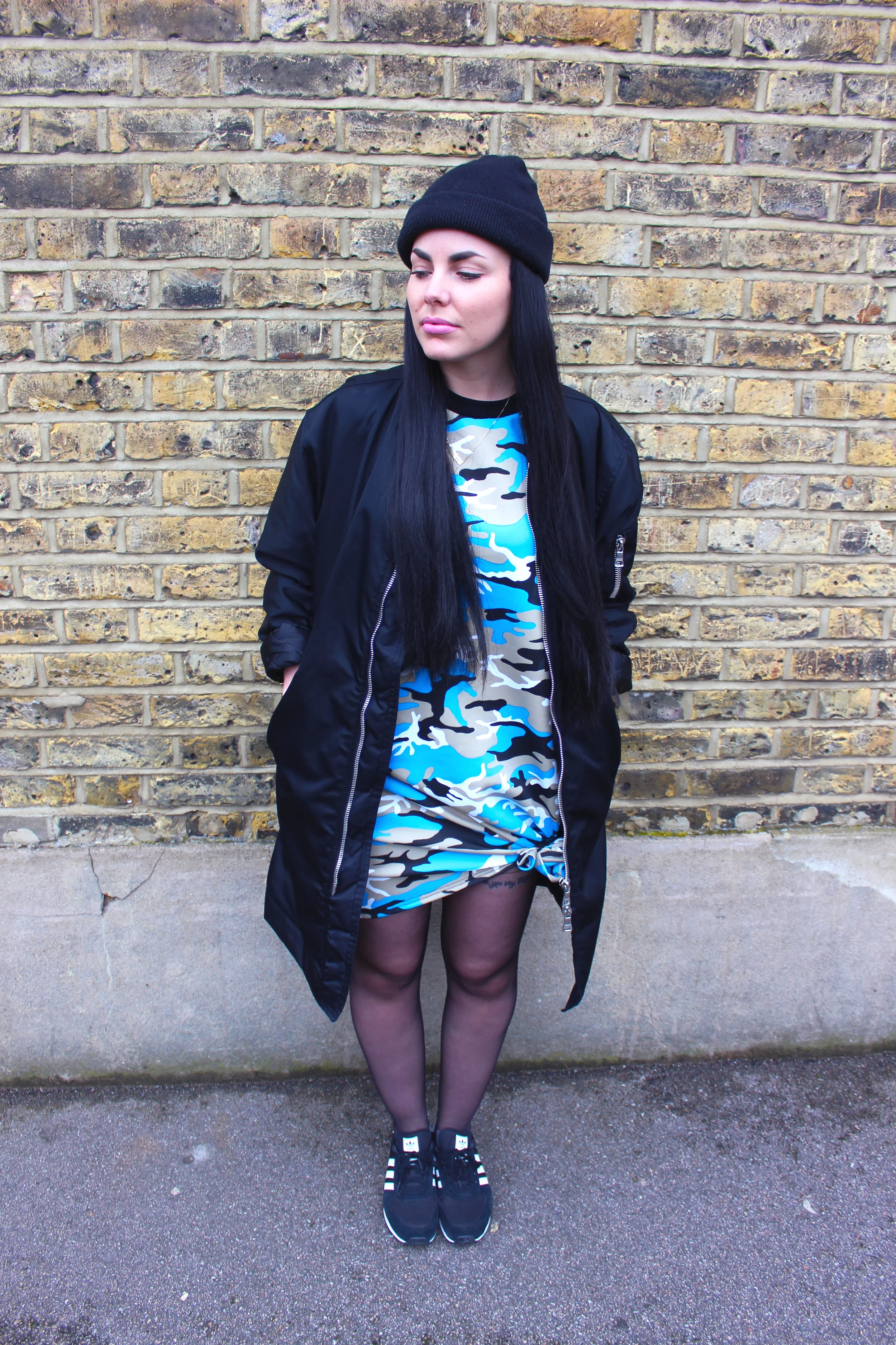 This dress is pretty striking and colourful so I wear just some plain Adidas old school Stan Smiths with it. If you want a jacket to match up with it I would probably also say something more plain. Like a black bomber jacket or something, that would do the trick :)
